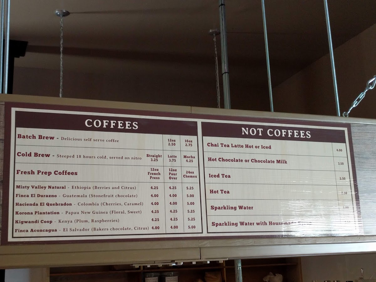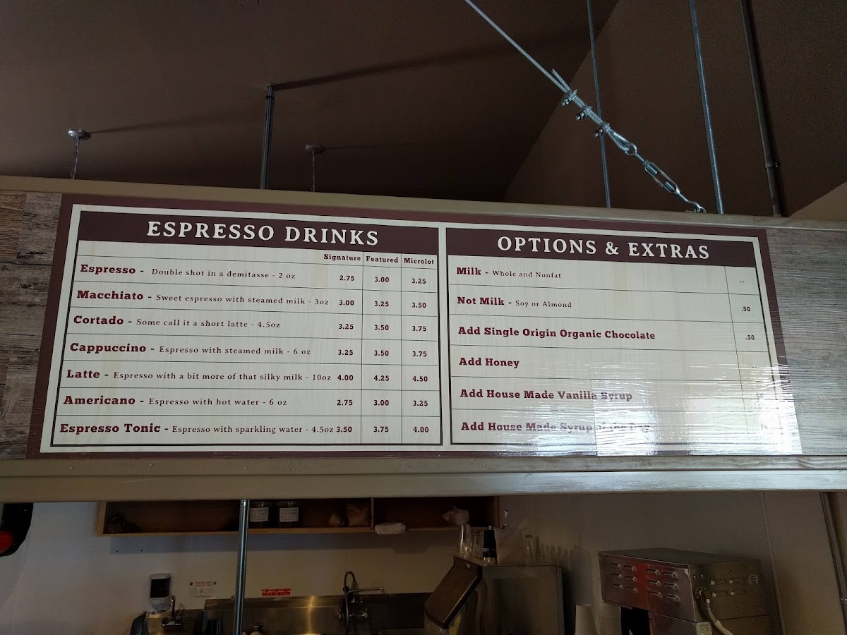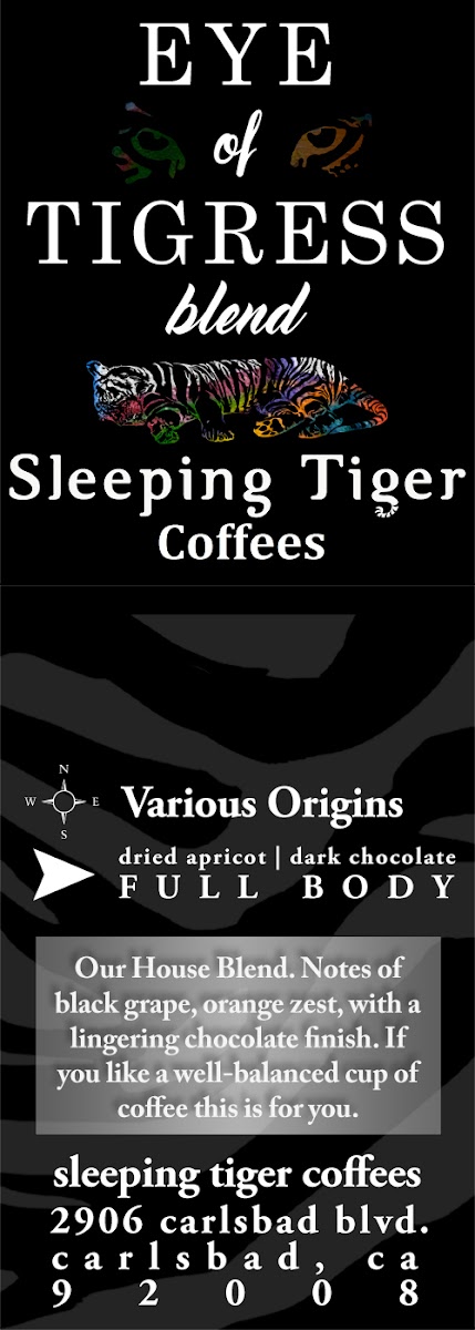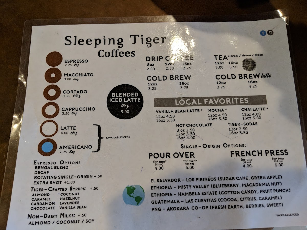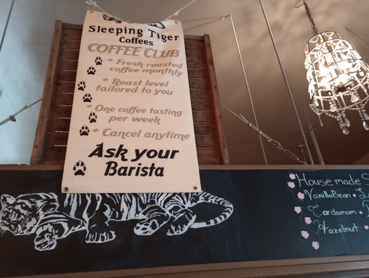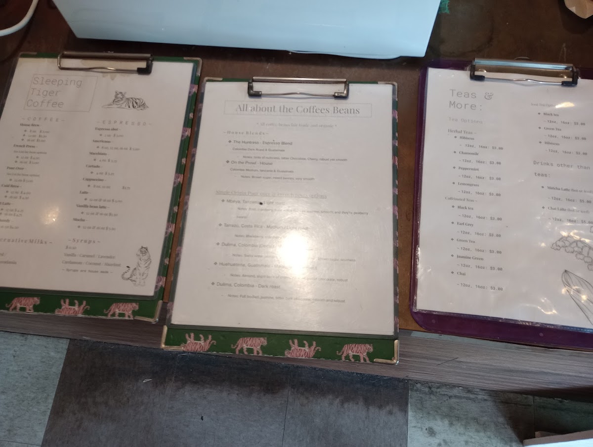 Sleeping Tiger Coffees offers a diverse and inviting menu that caters to all tastes, from coffee enthusiasts to those looking for refreshing non-coffee options. For coffee lovers, the Pour Over stands out as a crafted, refined choice. Espresso-based drinks include classics like Espresso and Macchiato, along with smooth options such as Cappuccino and Latte. The Chai Latte and Vanilla Bean Latte are local favorites, while the MochaHot Chocolate and Tiger-Sodas provide a sweet, indulgent alternative. For those looking for something different, the Matcha Latte and Chai Tea Latte offer a flavorful twist, and the Iced Tea or Sparkling Water provide a refreshing option for warmer days. The menu also features specialty fresh-prep coffees like Misty Valley Natural, Finca El Durazno, and Hacienda El Quebradon, which are perfect for those seeking high-quality, single-origin beans. Additionally, the Huntress - Espresso Blend and On The Prowl - House offer a rich and balanced experience. Extras like Milk or Not Milk provide customizable options to suit various preferences. Whether you're in the mood for a classic espresso drink or something more adventurous, Sleeping Tiger Coffees has something for every palate.